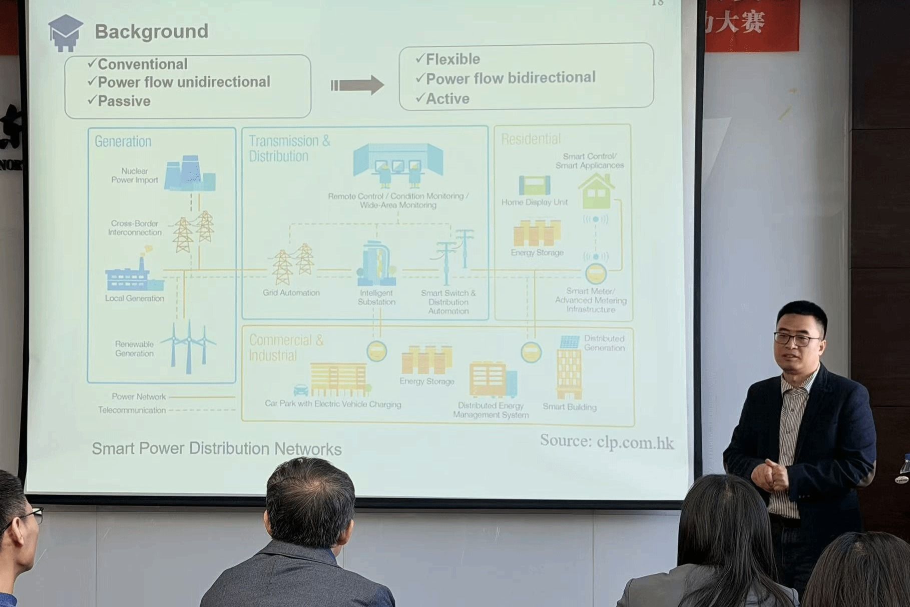 报告会上,龙超老师围绕数字能源与分布式能源管理的融合发展趋势,结合学科前沿动态与自身实践经验展开深度分享。首先,他立足自身在英国的留学与科研经历,系统阐释了机器学习与深度强化学习在提升电力系统智能化水平中的核心价值,通过实际案例呈现了数据驱动方法为电力系统优化调度、安全控制等领域带来的范式变革;然后,聚焦电动汽车规模化接入这一行业热点,从负荷预测精度提升、灵活调节机制构建及市场交易模式创新等维度,深入剖析了新型扰动下电网运行面临的关键挑战,并指明了相关前沿研究方向;最后,结合学科融合发展趋势,为在场师生的学业深造与职业规划提供了中肯建议,还分享了自身发表顶刊论文的亲身经验,从选题创新、实验验证到学术写作的全流程拆解实用技巧,鼓励大家夯实专业基础、保持科研探索热情。