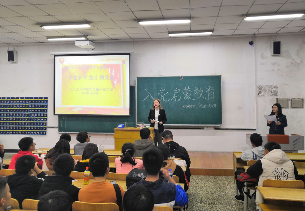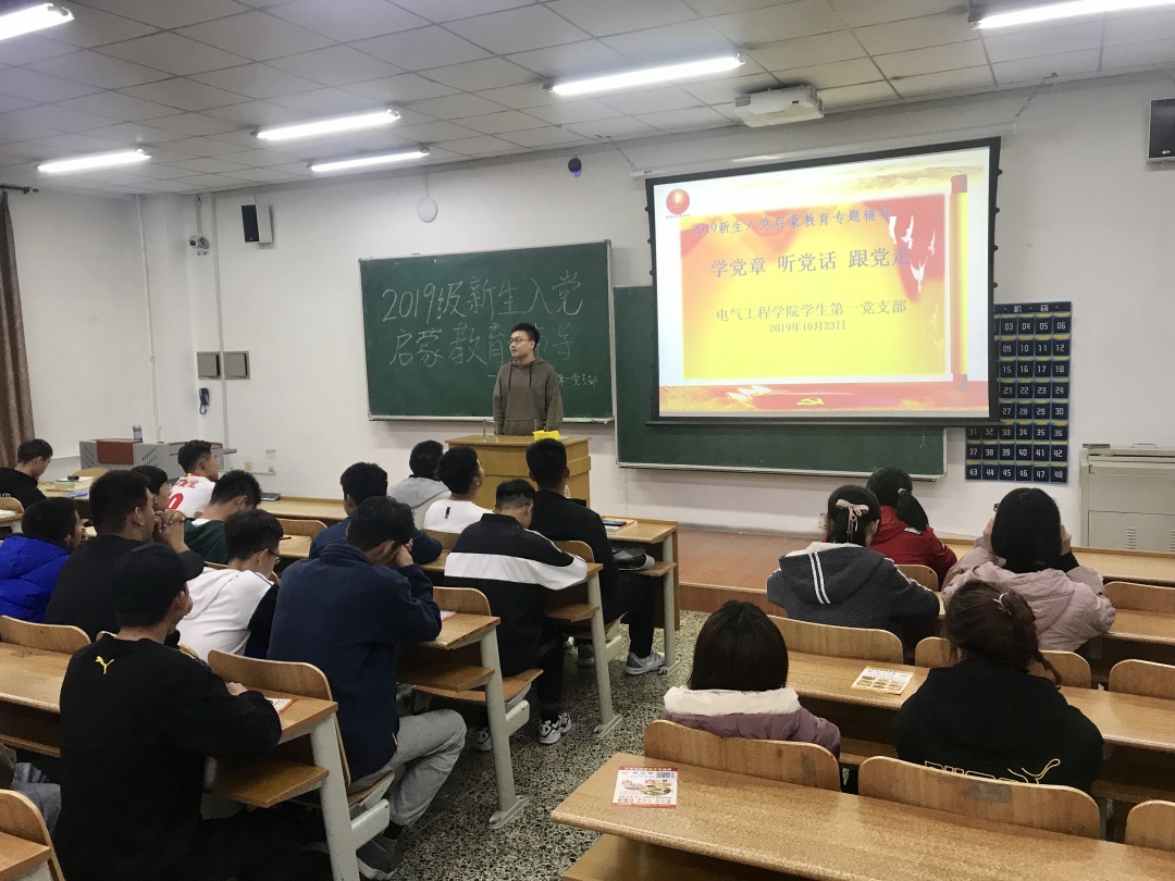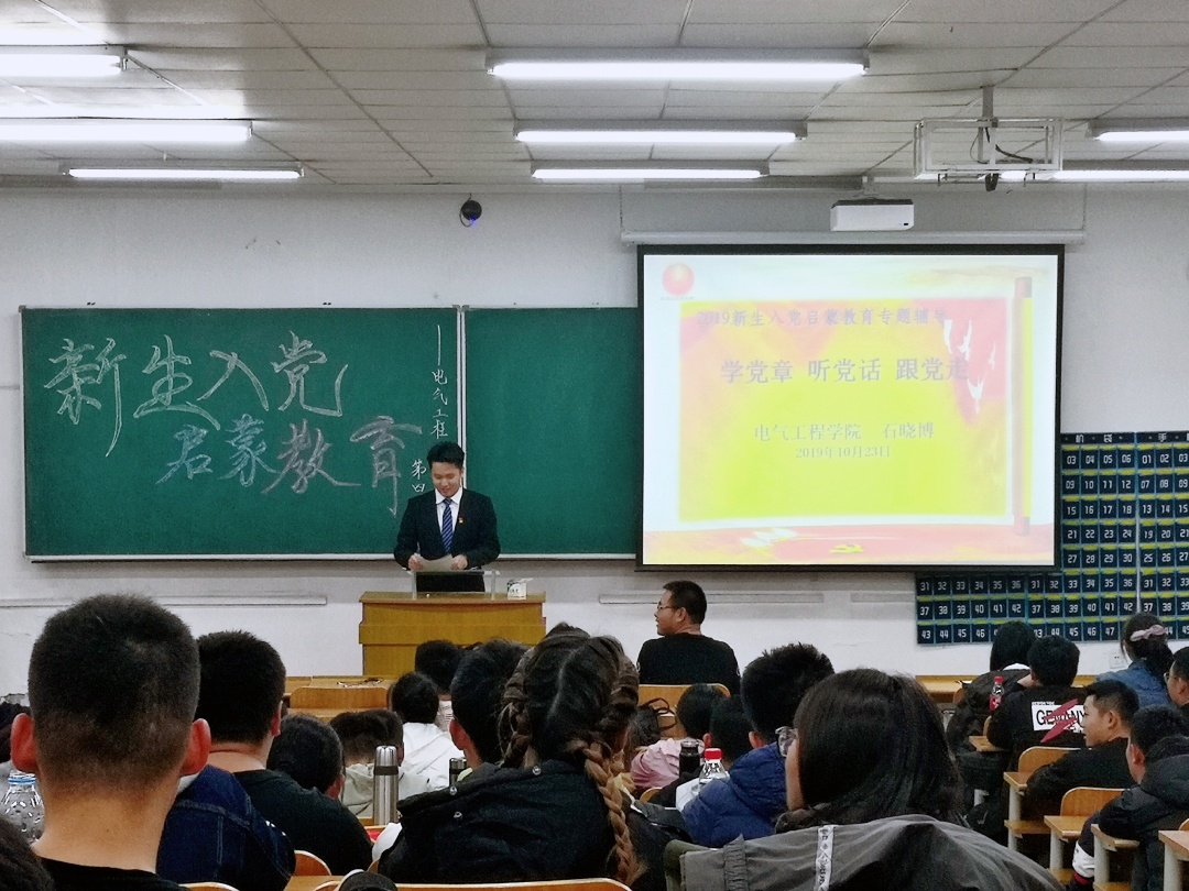 2019级新生入党启蒙教育讲座。主讲人分别由各个学生党支部推荐的优秀学生党员担任,他们分别是学生第一党支部刘溢、田鑫权、王昊宇、薛冰玉;学生第二党支部王康、章婉钰、赵晓涵;学生第三党支部谷奉锦;学生第四党支部石晓博;学生第五党支部姜锦涛、孙哲正;学生第六党支部张琳、高远航。