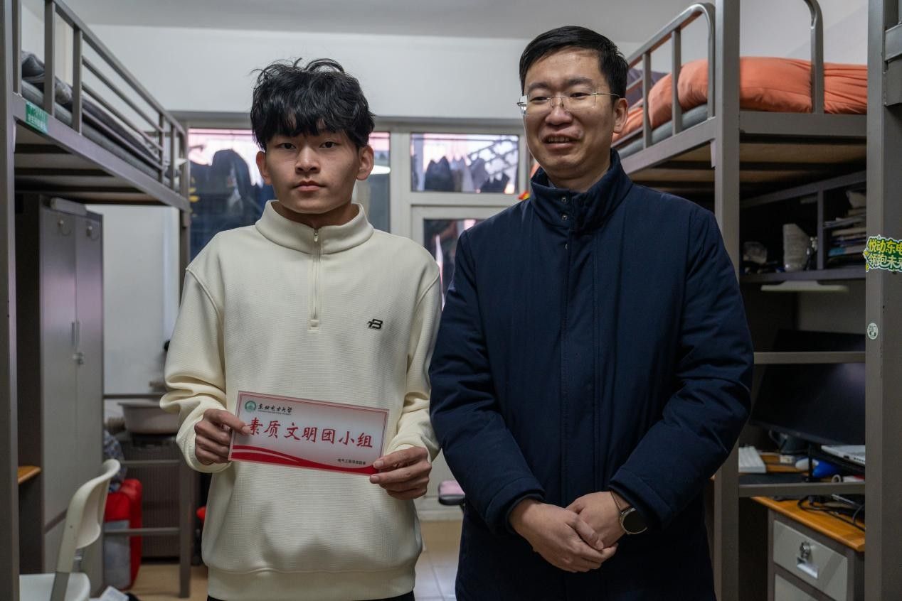 领导与校友一行深入学生宿舍走访慰问,赵丽书记、綦雪松校友与兰阳书记为素质文明团小组、卫生文明团小组等获评集体郑重授牌,以表彰其在班级建设、文明养成、卫生维护等方面的突出表现,引导各团小组发挥示范引领作用,带动全院学子共同营造文明和谐的校园氛围。