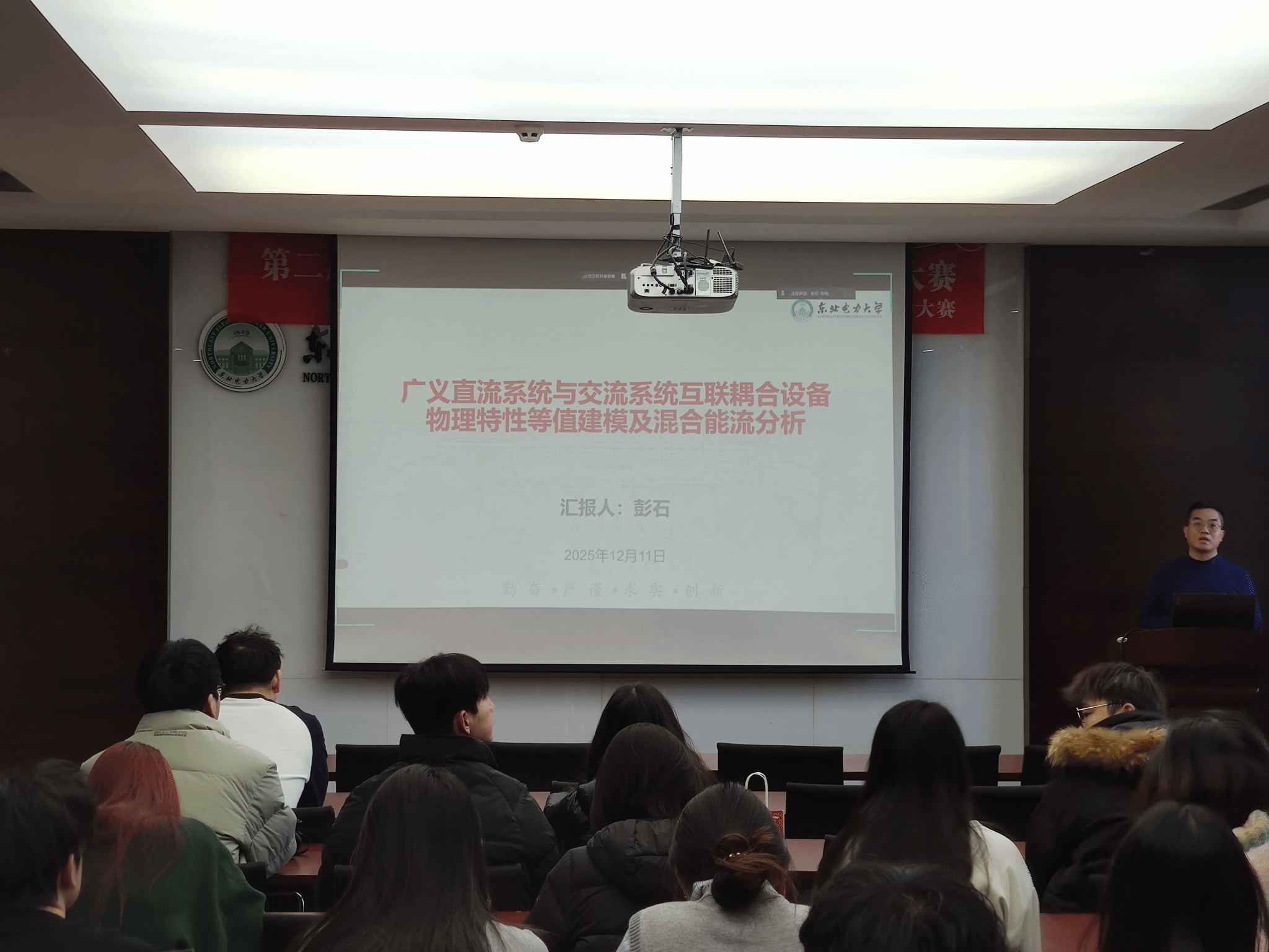 彭石老师在电动楼A412作了题为《广义直流系统与交流系统互联耦合设备物理特性等值建模及混合能流分析》的学术报告。报告会由足球直播平台