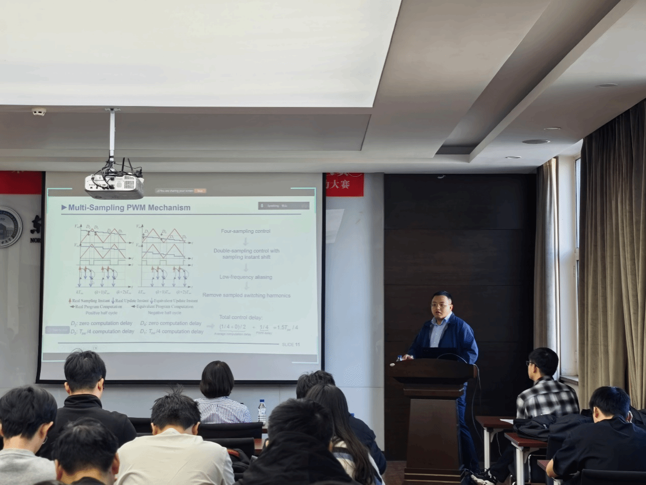 报告会上,贺山教授聚焦多采样技术在并网变流器中的应用核心主题,围绕新能源并网领域的技术升级需求展开分享。首先,他明确了并网变流器作为新能源与电网连接关键部件的核心定位,指出常规单采样、双采样控制在实际应用中的局限,以及高性能数字控制器成本降低背景下多采样控制的应用价值;然后,深入阐释了多采样脉宽调制的核心机理,分析其采样频率高于变换器开关频率两倍以上带来的开关纹波引入、控制自由度提升等关键特性;最后,从控制稳定性优化与状态监测强化两个维度,系统介绍了多采样技术在并网变流器中的具体应用路径,为新能源并网领域的技术升级提供了实用参考。