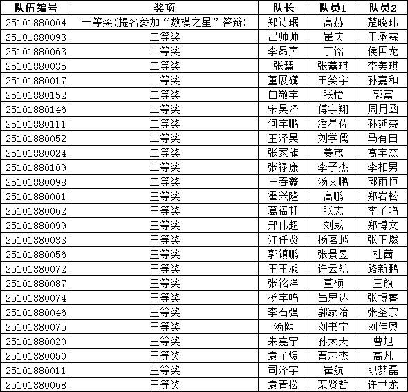本次竞赛中学院共有132支队伍报名参赛,参赛学生凭借扎实的学科功底、突出的创新能力及高效的团队协作,创下我院在该赛事中的历史最佳成绩:共获全国一等奖(获奖比例为1.00%)1项、二等奖(获奖比例为12.66%)11项、三等奖(获奖比例为19.82%)14项。2025年获奖人数达74人,较2024年增长105.6%,实现跨越式提升。值得关注的是,获得全国一等奖的小组凭借优异表现,已被提名参加“数模之星”全国总决赛答辩,将向更高荣誉发起冲击。